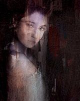 Bewerkt portret , in kleur, abstract. De blik van het meisje is erg raadselachtig. In de achtergrond donkerrode vlakken.