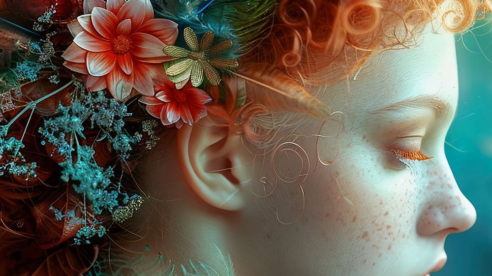 Dit kleurrijke portret is verkregen d.m.v Ai oftewel kunstmatige intelligentie . Het is een waar kunstwerk zoals het model is voorzien van bloemen en veren. De versiering op het hoofd is erg gedetailleerd en van rijke kleuren voorzien. De blauwe en oranje tinten vormen samen een prachtig palet, wat aan de muur van een hedendaags interieur prachtig tot zijn recht zal komen. Dit werk valt onder surrealistische fotografie.