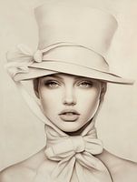 In deze elegante compositie wordt een vrouw afgebeeld in een tijdloze, verfijnde stijl. Haar blik is intens en doordringend, met ogen die een verhaal lijken te vertellen dat diep begraven ligt in de lagen van haar ziel. Ze draagt een opvallende hoge hoed met een grote, dramatische strik die haar uitstraling zowel mysterieus als verfijnd maakt. De monochrome kleuren en zachte contouren van het portret geven het werk een klassieke en bijna ethereal uitstraling, alsof het een stil moment in de tijd heeft vastgelegd.