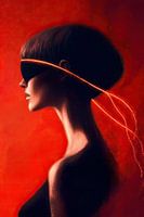 Mysterieus en-profile portret van een vrouw tegen een vuurrode achtergrond. Het schilderij straalt kracht, passie en eigenzinnigheid uit. De vrouw draagt een zonnebril en kijkt zelfverzekerd het kader uit. De neon vurige rode lijnen lijken te komen als draden vanuit haar zonnebril. Het geeft het werk een mysterieuze surrealistische laag.