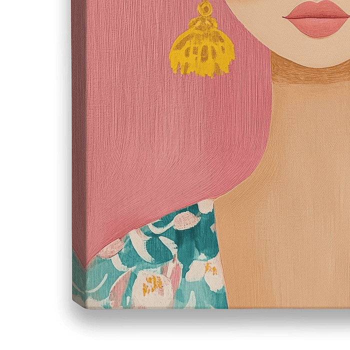 Dit kunstwerk toont een serene vrouw met haar ogen gesloten, in pastelkleuren en omringd door bloemen. De vrouw heeft een zachte uitdrukking op haar gezicht, met roze blosjes op haar wangen en subtiele lippen in een natuurlijke roze tint. Het geheel straalt rust en eenheid met de natuur uit, alsof de vrouw één is met de bloemen om haar heen.