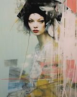 Portret in pastelkleuren gecombineerd met zwart voor het nodige contrast. Deels abstract en deels realistisch, wat een mooi en bijzonder effect geeft.