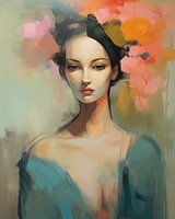 Portret in pastelkleuren van een jonge vrouw met roze en oranje bloemen. Kies zelf het formaat en materiaal voor deze blikvanger en maak haar passend voor jouw interieur.