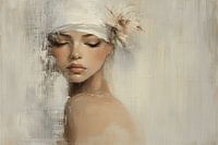 Een elegant portret van een vrouw met een serene, ingetogen uitstraling. Haar ogen zijn gesloten, alsof ze zich in een moment van diepe rust of contemplatie bevindt. Een grote bloem siert haar hoofddeksel, wat de zachtheid van haar gelaat versterkt. De vloeiende penseelstreken geven het geheel een dromerige sfeer, terwijl de subtiele tinten van het schilderij haar schoonheid en zelfverzekerdheid benadrukken.