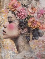 Portret in roze, vintage stijl, mixed media. Kies zelf het formaat en materiaal bij dit werk en maak er een echte blikvanger van voor jouw interieur. Vrouw met bloemen in het haar, roze rozen.