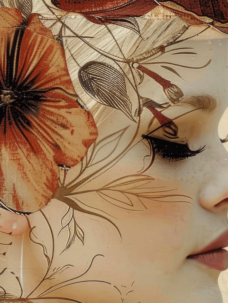 Portret in vintage mixed media stijl van een jonge vrouw met bloemen, een vlinder en letters. In aardetinten. Modern en abstract.