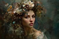Portret in warme tinten met botanische elementen. Een realistisch portret van een jonge vrouw, omringd door bloemen. Modern met een klassieke "touch".