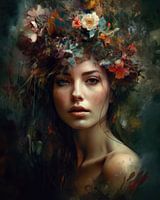Portret in warme tinten met botanische elementen. Een realistisch portret van een jonge vrouw, omringd door bloemen. Modern met een klassieke "touch".