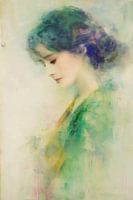 Een portret in zachte aquareltinten, waar turquoise en groene tinten subtiel in elkaar overvloeien. De dromerige compositie toont een elegant zijprofiel in een delicate, bijna transparante stijl. Het kunstwerk straalt een tijdloze romantiek uit, waarbij de vloeiende penseelstreken en de etherische uitstraling een sfeer van mysterie en…