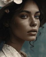 Portret in zachte pastelkleuren. Bijzondere blikvanger van een jonge vrouw met sproeten die je recht in je ziel kijkt. Hier blijf je naar kijken. Bijzondere blikvanger. Dit werk komt het best tot haar recht op artframe, aluminium of dibond.