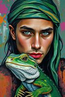 Schoonheid en diversiteit > Portret > Jonge man met hagedis > Een kleurrijk portret van een jonge man die een bijzondere vriendschap heeft met een hagedis. De kleurencombinatie past in veel kamers, vooral in die met de muurkleuren grijs, groen in al zijn variaties, aubergine, verschillende tinten blauw, verschillende tinten…