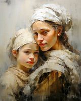 Rene van den Berg, bekend om zijn vermogen om klassieke kunst te herinterpreteren, presenteert een digitaal meesterwerk geïnspireerd op de stijl van de oude meester Rembrandt. Dit portret, dat een jonge vrouw en haar jonge dochter afbeeldt, is een prachtige fusie van traditionele technieken en moderne digitale kunst. De diepe schaduwen en het subtiele lichtspel, kenmerkend voor Rembrandt's werk, zijn hier meesterlijk vastgelegd. De gezichten van de vrouw en het kind stralen warmte en intimiteit uit, hun blikken vervuld van liefde en verbondenheid. Terwijl de textuur en de tonaliteit herinneren aan olieverf op doek, zijn er subtiele digitale nuances die het kunstwerk een hedendaags gevoel geven. Van den Berg's interpretatie is zowel een eerbetoon aan de tijdloze schoonheid van Rembrandt's kunst als een viering van de mogelijkheden van digitale creativiteit. Het resultaat is een tijdloos portret dat generaties overbrugt.
