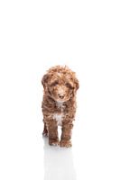 Dit is een foto van een labradoodle puppy op een witte achtergrond en met reflectie op de grond. De puppy kijkt recht in de lens.