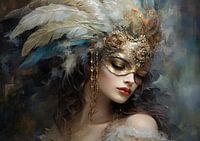 Details: masker, vrouw, veren, goud, blauw, bruin, elegant, mysterieus, realisme, portret, Romantische droomwereld