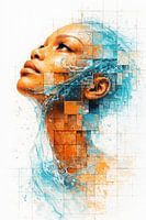 Dit kunstwerk toont een gestileerd portret van een vrouw die omhoog kijkt, waarbij realistische gelaatstrekken worden gecombineerd met abstracte, kleurrijke elementen. Het gezicht is gedetailleerd weergegeven, terwijl de rest van het hoofd en de hals overgaan in een mozaïek van vierkante vlakken in oranje en blauw. Door deze…