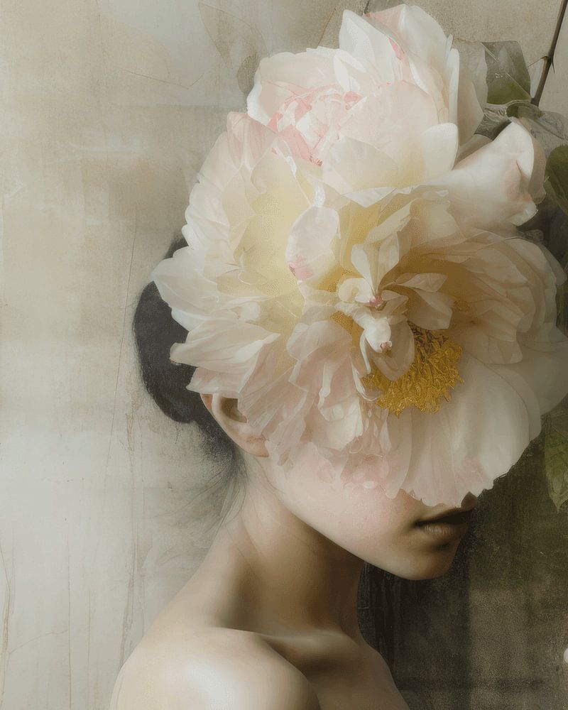 Portret met bloemen in wabi-sabi stijl. Pastelkleuren. In de traditionele Japanse esthetiek is wabi-sabi een wereldbeeld waarin de acceptatie van vergankelijkheid en imperfectie centraal staat. De esthetiek wordt soms beschreven als een waardering voor schoonheid die "onvolmaakt, vergankelijk en onvolledig" van aard is. Het komt veel voor in vele vormen van Japanse kunst.