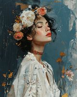 Portret met een dromerige uitstraling van een jonge vrouw met bloemen in het haar. Romantisch, nieuw landelijk en eclectisch. Dit is een bijzondere blikvanger!