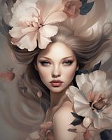 Portret met een romantische uitstraling in roze. Meisje met bloemen. Kies zelf het formaat en materiaal voor dit werk en maak het passend voor jouw interieur.