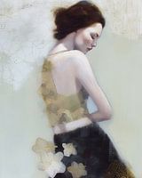 Portret van een jonge vrouw gezien vanaf haar rug. Een serene en poëtische uitstraling. Zachte kleuren met gouden accenten. Met dit werk haal je echt iets bijzonders in huis!