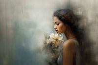 Portret met een zachte en romantische uitstraling. Een deels realistisch en deels abstract portret van een jonge vrouw met een bloem in pastelkleuren.