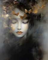 Portret met een zachte uitstraling in zwart en goud. Een bijzondere blikvanger! Kies zelf het formaat en materiaal voor dit werk zodat het perfect in je interieur past.