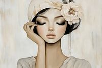 Portret met een zachte uitstraling, pastelkleuren. Met een vleugje gouden accenten. Een bijzondere blikvanger voor je interieur! Kies zelf het formaat en materiaal bij dit werk en maak het helemaal naar wens.