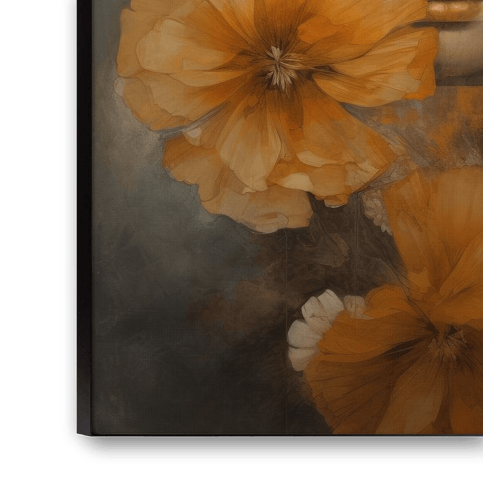 Portret modern chic met oranje bloemen. Mixed media, gemengde techniek. Dit is een bijzondere blikvanger voor je interieur. Kies zelf het formaat en materiaal bij dit werk en maak het helemaal naar wens.