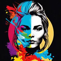 Popart afbeelding van een prachtige vrouw. Half zwart wit en half kleurrijk met een ronde gekleurde cirkel op de achtergrond. Passend bij diverse trends en stijlen.