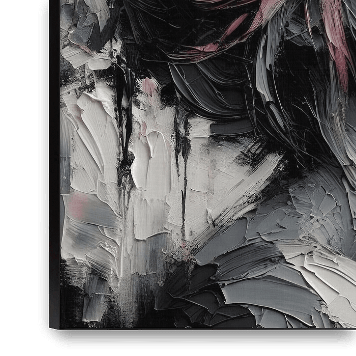 Ontdek de rauwe schoonheid van deze uitgevoerde zwart-wit olieverfschildering met de interieurkleur van dit jaar roze, waar de krachtige penseelstreken een unieke dimensie toevoegen aan het vrouwenportret. Dit kunstwerk ademt expressie en karakter, waardoor elke ruimte doordrenkt wordt met een ongepolijste, authentieke sfeer.