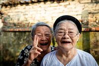 Portret van 2 oude vrouwtjes in Vietnam. Hun tanden zijn zwart van de tabak die ze kauwen. Één vrouwtje maakt het peace gebaar.