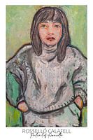 Dit portret toont een jong meisje in een kalme maar zelfverzekerde pose, met haar handen in haar zakken en een blik die zweeft tussen introspectie en stille vastberadenheid. De zachtgroene achtergrond contrasteert met de dikke, gestructureerde lagen grijs en aardetinten in haar trui. Van dichtbij onthullen onregelmatige lijnen en kleine…