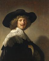 Dit portret op borstlengte van een jongeman met lang krullend blond haar en een breedgerande hoed heeft een aantrekkelijke directheid die de kijker onmiddellijk aanspreekt. De elegante houding en verfijnde gelaatstrekken van de man worden versterkt door zijn stijlvolle opgestoken snor en zorgvuldig gemanicuurde kuif. Zijn uitgestrekte brede kanten kraag en manchet, die scherp afsteken tegen zijn zwarte mantel, waren op het hoogtepunt van de mode in 1635 toen hij zich liet portretteren. Terwijl hij over zijn rechterschouder naar de toeschouwer kijkt, heeft de geportretteerde zijn rechterhand naar zijn borst gebracht in een gebaar dat nederigheid en oprechtheid uitstraalt.