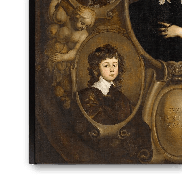 Op het portret ontbreekt Huygens’ vrouw Suzanne van Baerle. Zij was twee jaar eerder in het kraambed overleden bij de geboorte van hun jongste dochter.