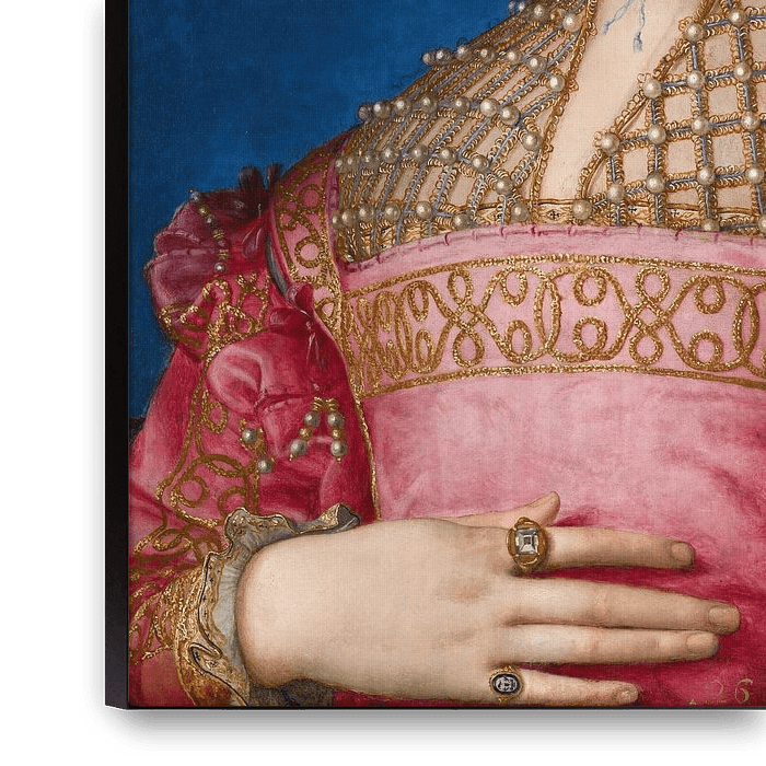 Koop Portret van Eleonora van Toledo, Agnolo Bronzino als reproductie op canvas, aluminium dibond, (ingelijste) fotoprint, behang en ArtFrame, op maat geprint in Fine-Art kwaliteit.