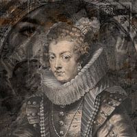 Een portret van koningin Elisabet van Bourbon, naar een ets van Paulus Pontius. De ets is ingekleurd en geplaatst in een collage van aanplakbiljetten. Over haar schouder kijkt een prachtige dame met haar mee.