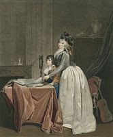 Portret van de 16-jarige Louise-Sébastienne Gély, kort na haar huwelijk met de beroemde revolutionair Georges-Jacques Danton. Naast haar de zoon van Danton uit een eerder huwelijk. Hij bekijkt de prenten die op tafel liggen door een zogenaamde opticaspiegel.