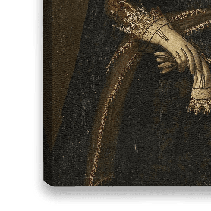 Zuster van Johan van Ceters. Kniestuk, staande naar rechts. Handschoen in de rechterhand, een waaier in de linkerhand. Rechtsboven het familiewapen.
