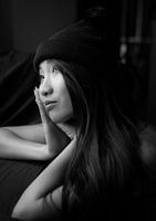 Een schattige foto van Minh-Ly in B&W. Vaak kijken modellen erg serieus. Ik wilde een foto maken waarop ze ontspannen was.
