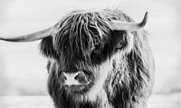 Close up van stoer rund in zwart wit. De foto is genomen op 10 februari 2021, op het Scharreveld, in Drenthe (Nederland)