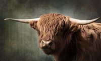 Deze koe is door mij gefotografeerd op het Scharreveld (Drenthe), Nederland, in april 2021. En daarna bewerkt met een vintage achtergrond. Met waterverf details. Je ziet er van alles in terug komen. Een oude landkaart, een ansichtkaart, tekst. Als je er naar kijkt zie je steeds meer details. Een robuuste stoere plaat heb ik willen neerzetten.