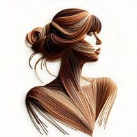 Een delicaat portret van een vrouw met opgestoken haar, gevormd uit touw in zachte bruine en beige tinten. De natuurlijke texturen en vloeiende lijnen geven het werk een serene en verfijnde uitstraling. Dit werk vangt de essentie van zachtheid en kracht in een harmonieus spel van kleur en vorm.