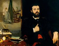Zacharie Astruc behoorde tot de vroege kampioenen van Edouard Manet's kunst. Hij was kunstcriticus en journalist, maar ook dichter en componist, schilder en beeldhouwer, en speelde een centrale rol in de Parijse kunstscene in de tweede helft van de 19e eeuw. Het stilleven aan de linkerrand van het schilderij getuigt van de veelzijdigheid van Astruc: De boeken en de pen identificeren hem als een literaire figuur, de houtsneden getuigen van zijn liefde voor de Japanse kunst, de gevouwen waaier en de rode cummerbund tonen zijn enthousiasme voor Spanje, en het snaarinstrument in de kamer ernaast staat voor zijn muzikaliteit. De blik van Astruc ontmoet de toeschouwer, en toch lijkt het in zichzelf gekeerd. Zijn hand, gedeeltelijk verborgen door zijn vest, ligt op zijn hart - een gebaar van oprechtheid. Hij lijkt op mysterieuze wijze afwezig. De ruimte om hem heen is ook een mysterie. Door een beeld te maken binnen een beeld, heeft Manet een ander niveau van werkelijkheid gecreëerd, zonder dat het duidelijk is of het nu gaat om een blik in de volgende kamer, een spiegelbeeld, of een geschilderd beeld. Met deze compositie verwijst de kunstenaar naar Titiaan's Venus van Urbino.