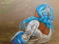 Portret / Vrouw / Pastelkrijt / Schilderij /Pastel tekening / Afrika / The Gamba / Land in Afrika / Kijken / Cultuur / Hoofddoek / Blauw / Bruin / Mooie mensen/ Zitten / Denken / Overpeinzen / Figuratieve kunst