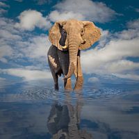 In dit composiet werk zie je een Afrikaanse olifant (Loxodonta africana) die hoog boven de fotograaf uittorent. De Olifant staat in het water tegen een achtergrond van blauwe lucht met witte wolken.