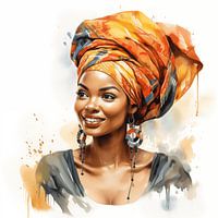 Portret van een Afrikaanse vrouw met glimlachend aquarel kunstontwerp en kleurrijke hoofddoek op een witte achtergrond