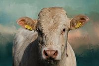 Een fel Charolais-kalf, dat tot de kudde van mijn buurman behoort, kijkt recht in de camera. De achtergrond van groene en oranje-roze tinten is abstract. De uitdrukking van het kalf is kalm en nieuwsgierig. Charolais-runderen zijn een Frans runderras.