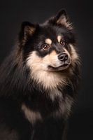 Een mooi portret tegen een zwarte achtergrond van een Finse Lappenhond genaamd Puck. De hond heeft een lieve en schattige blik. Van deze hond zijn meer portretten beschikbaar in mijn shop. Ook is dit portret in zwart-wit beschikbaar.