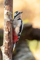Portret van een grote bonte specht. Grote afdruk mogelijk. Afbeelding 4657 op 6986 px. Foto genomen vanuit een tijdelijke foto hut in het bos.