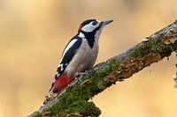 Portret van een grote bonte specht. Grote afdruk mogelijk. Afbeelding 8256 op 5504 px. Foto genomen vanuit een tijdelijke foto hut in het bos.