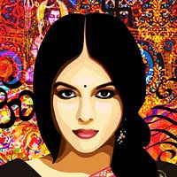 Een Indiase vrouw getekend op een achtergrond van patronen en symbolen afkomstig uit haar cultuur.